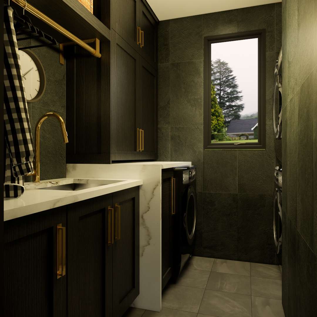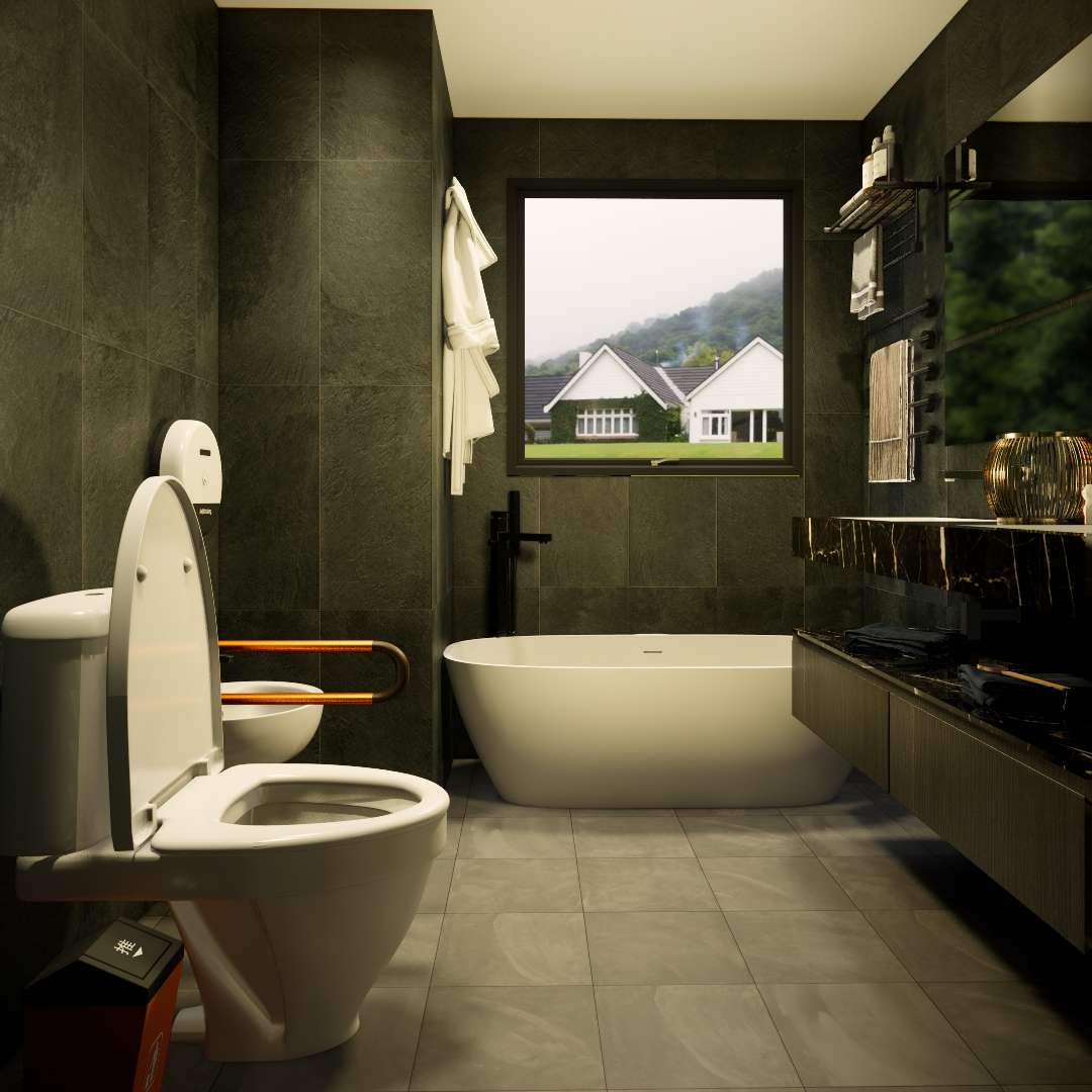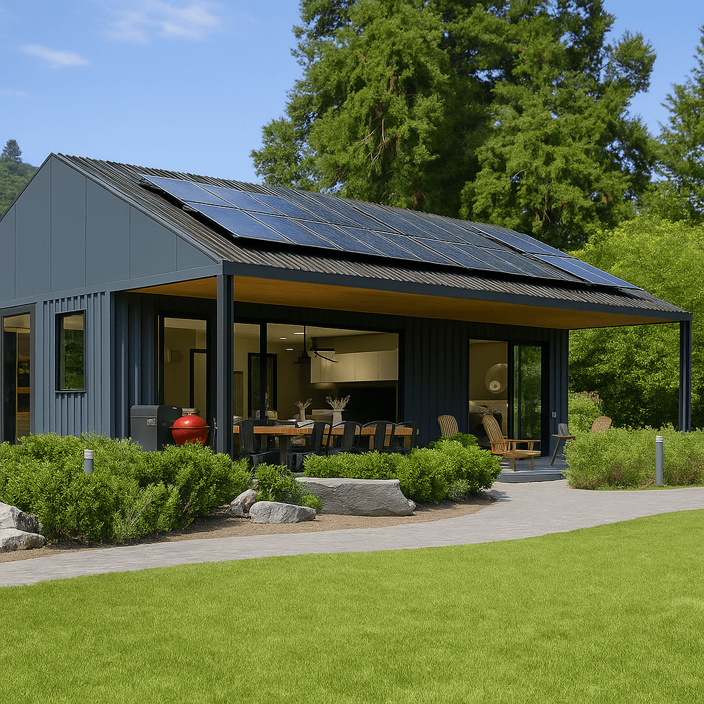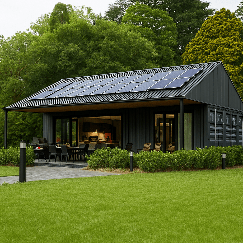 Exterior: Harmonizando com a Natureza e a Tecnologia. À primeira vista, esta casa causa uma forte impressão. Seu exterior simples, porém sofisticado, apresenta uma fachada moderna em cinza escuro, destacando-se contra a exuberante paisagem verde natural. A característica mais significativa é o sistema de painéis solares cuidadosamente instalado no telhado inclinado, mostrando um compromisso com a sustentabilidade e a eficiência energética. O amplo toldo proporciona sombra, abrindo espaço para uma área de convivência ao ar livre ideal.
