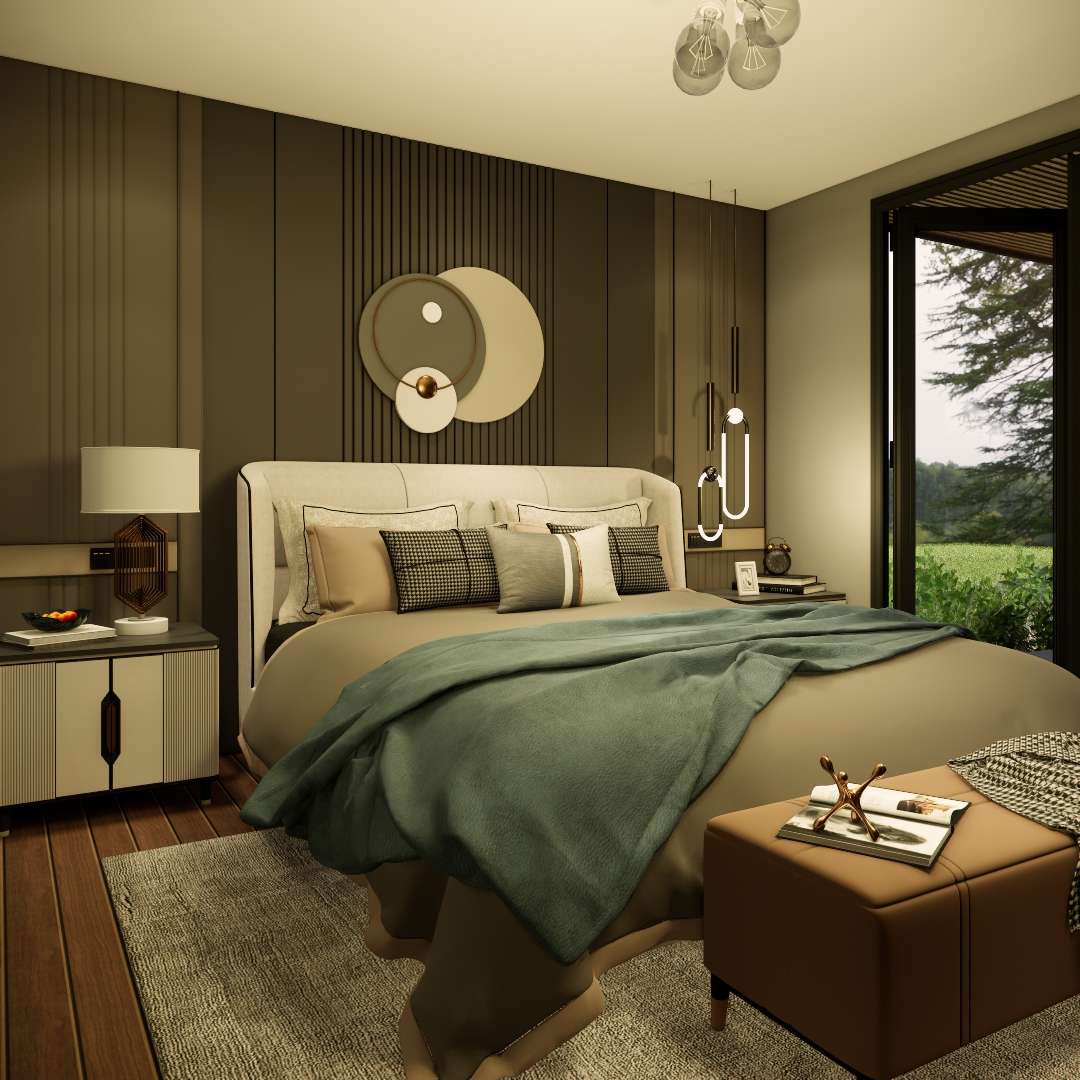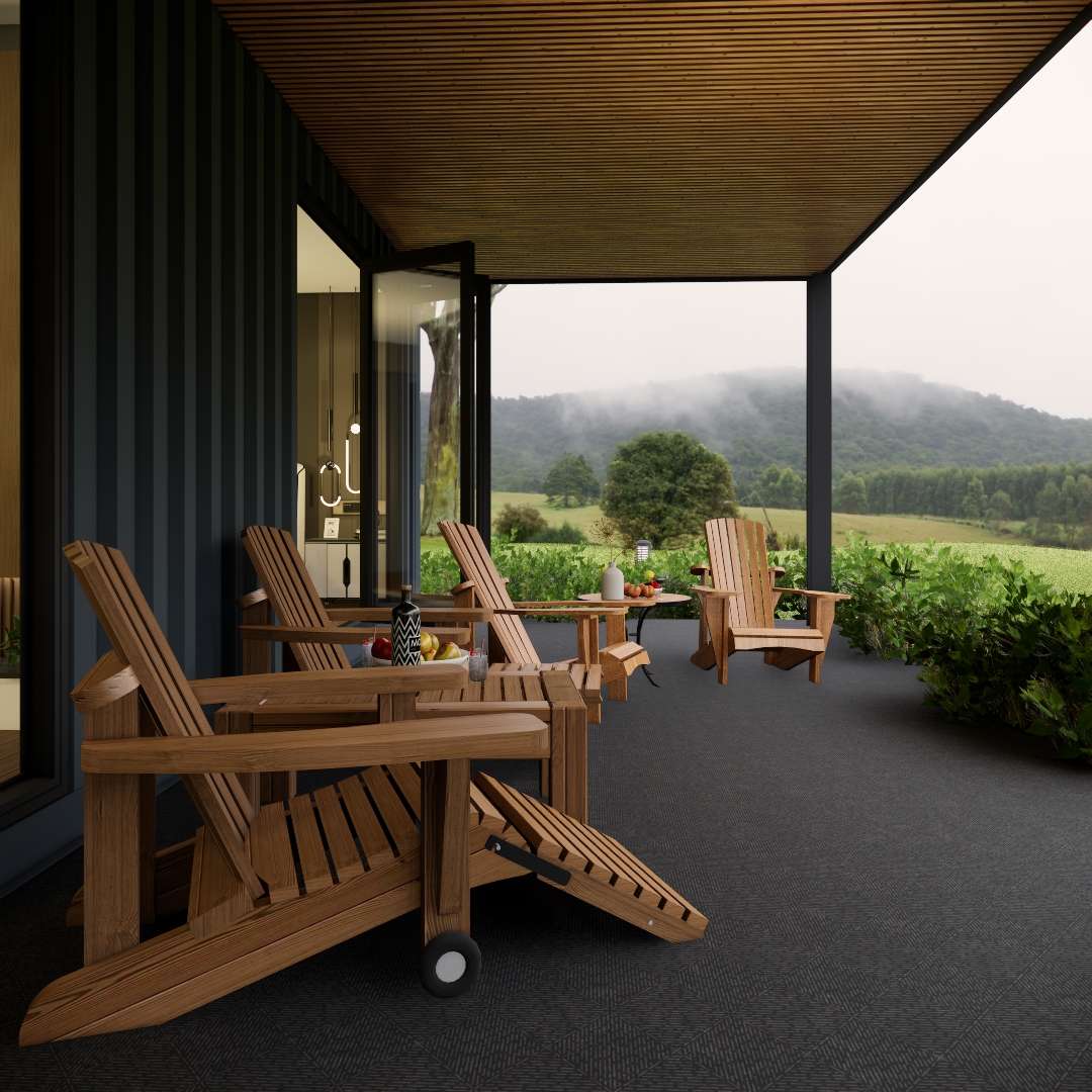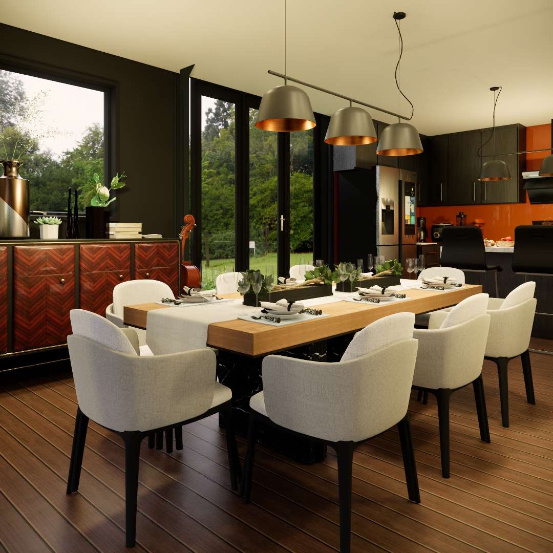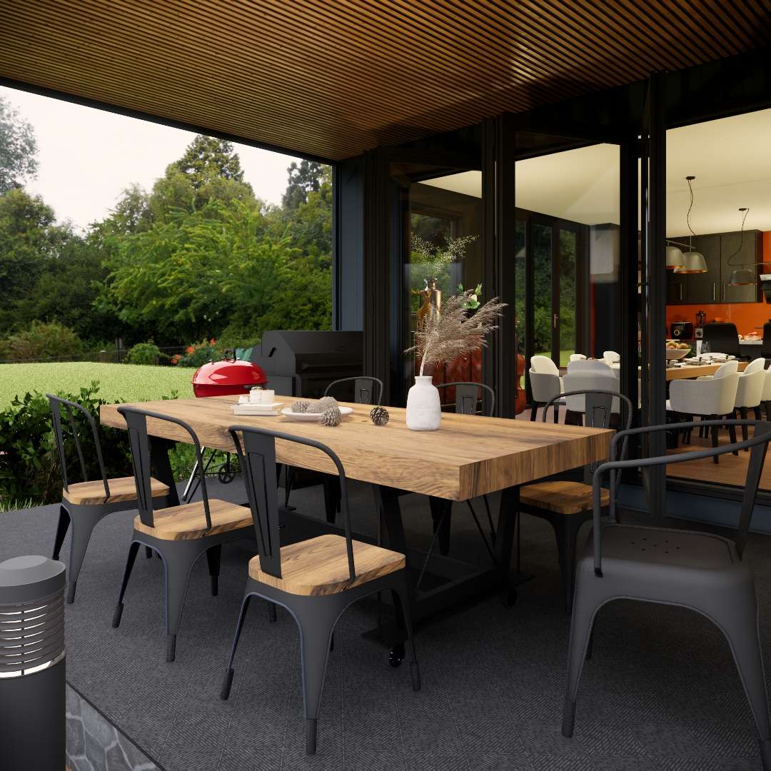 Pátio Externo: Ampliando o Espaço de Vida. A área do pátio externo é uma ponte fantástica entre os espaços internos e externos. Com piso escuro pavimentado e um teto de madeira com ripas, essa área se transforma em uma luxuosa zona de jantar e relaxamento ao ar livre.