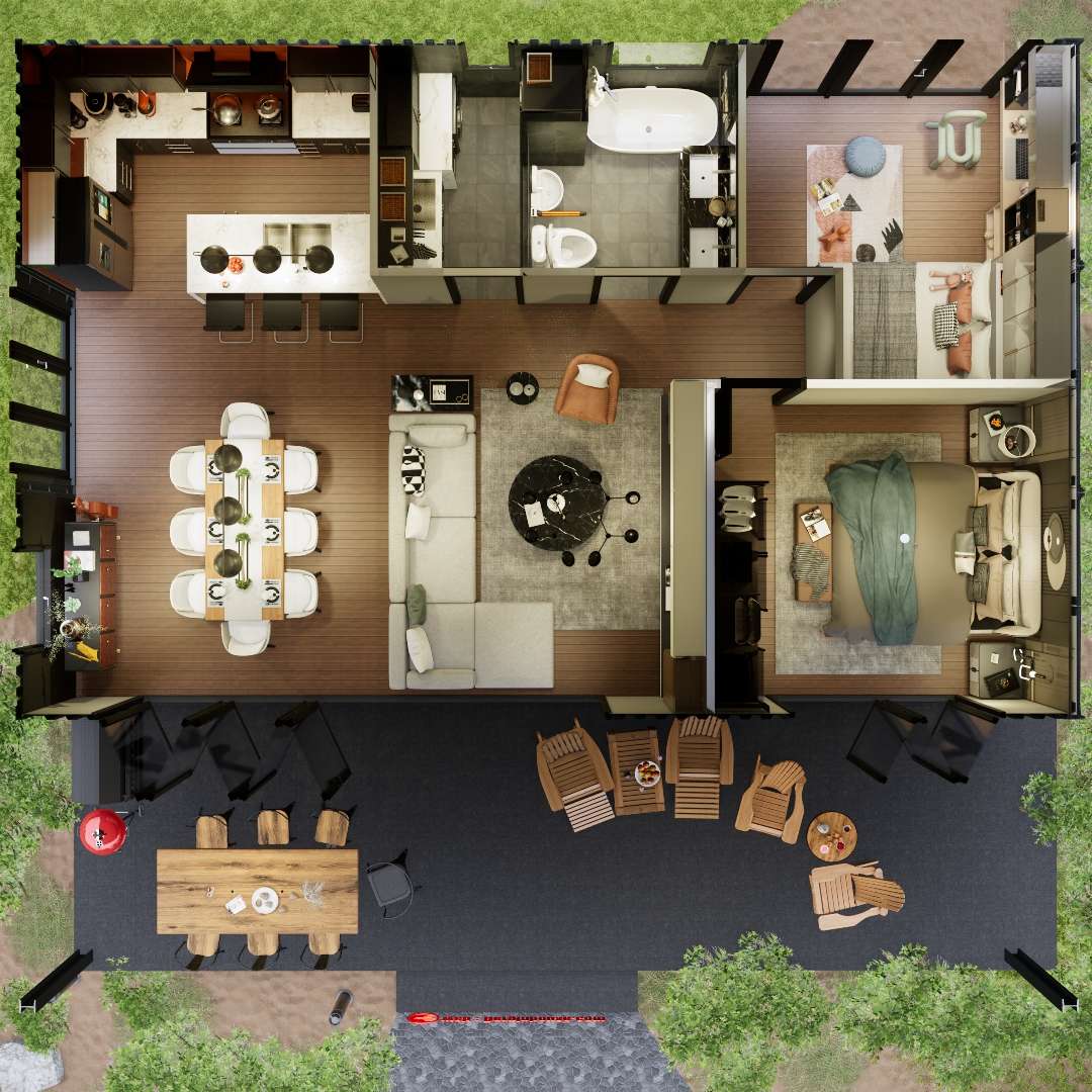 Uma Jornada pelo Lar Contêiner Moderno e Sustentável: No mundo da arquitetura em rápida evolução, os lares contêiner surgiram como uma solução de design que é ao mesmo tempo moderna e sustentável, misturando o conforto da vida contemporânea com a responsabilidade ecológica. Hoje, vamos explorar um exemplo perfeito: um charmoso lar contêiner com 2 quartos e 1 banheiro, cuidadosamente projetado e totalmente funcional.